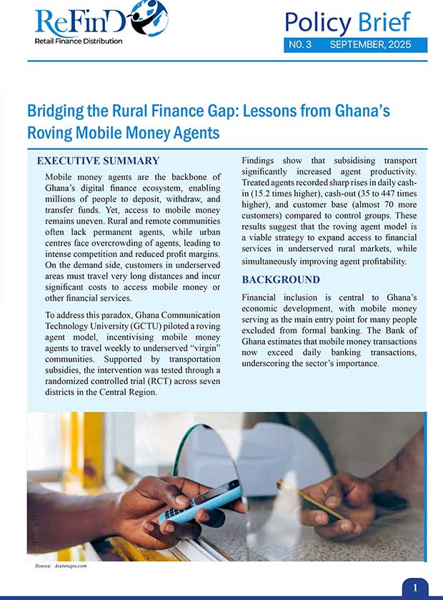 To address this paradox, Ghana Communication Technology University (GCTU) piloted a roving agent model, incentivising mobile money agents to travel weekly to underserved “virgin” communities. Supported by transportation subsidies, the intervention was tested through a randomized controlled trial (RCT) across seven districts in the Central Region.