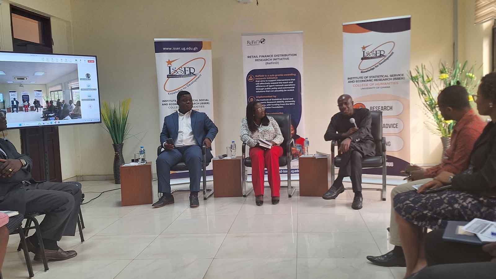 Prof. Peter Quartey of ISSER and Mr. Ebenezer Asante from MTN engage participants during the fireside conversation, moderated by Adadzewa Otoo, ReFinD Project Director.